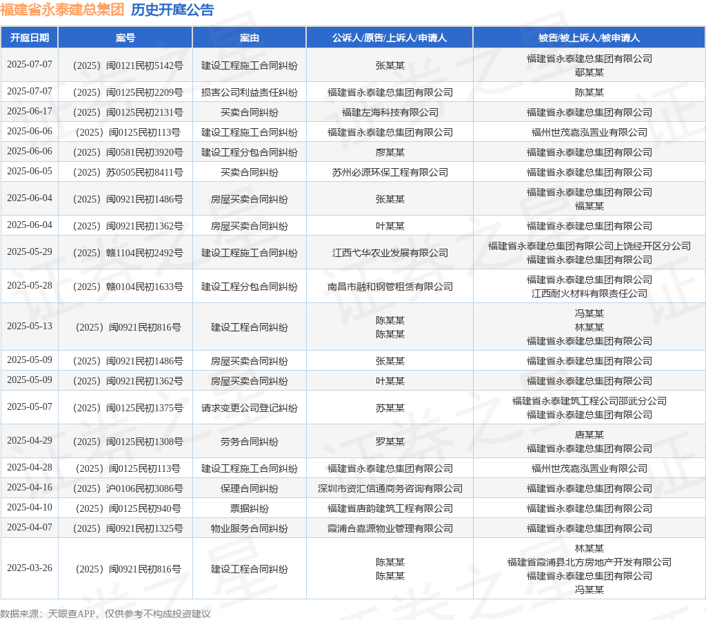 本站消息,根据天眼查APP显示,近日公布了一则福建省永泰建总集团有限公司作为被告/被上诉人的开庭公告,详细内容如下: